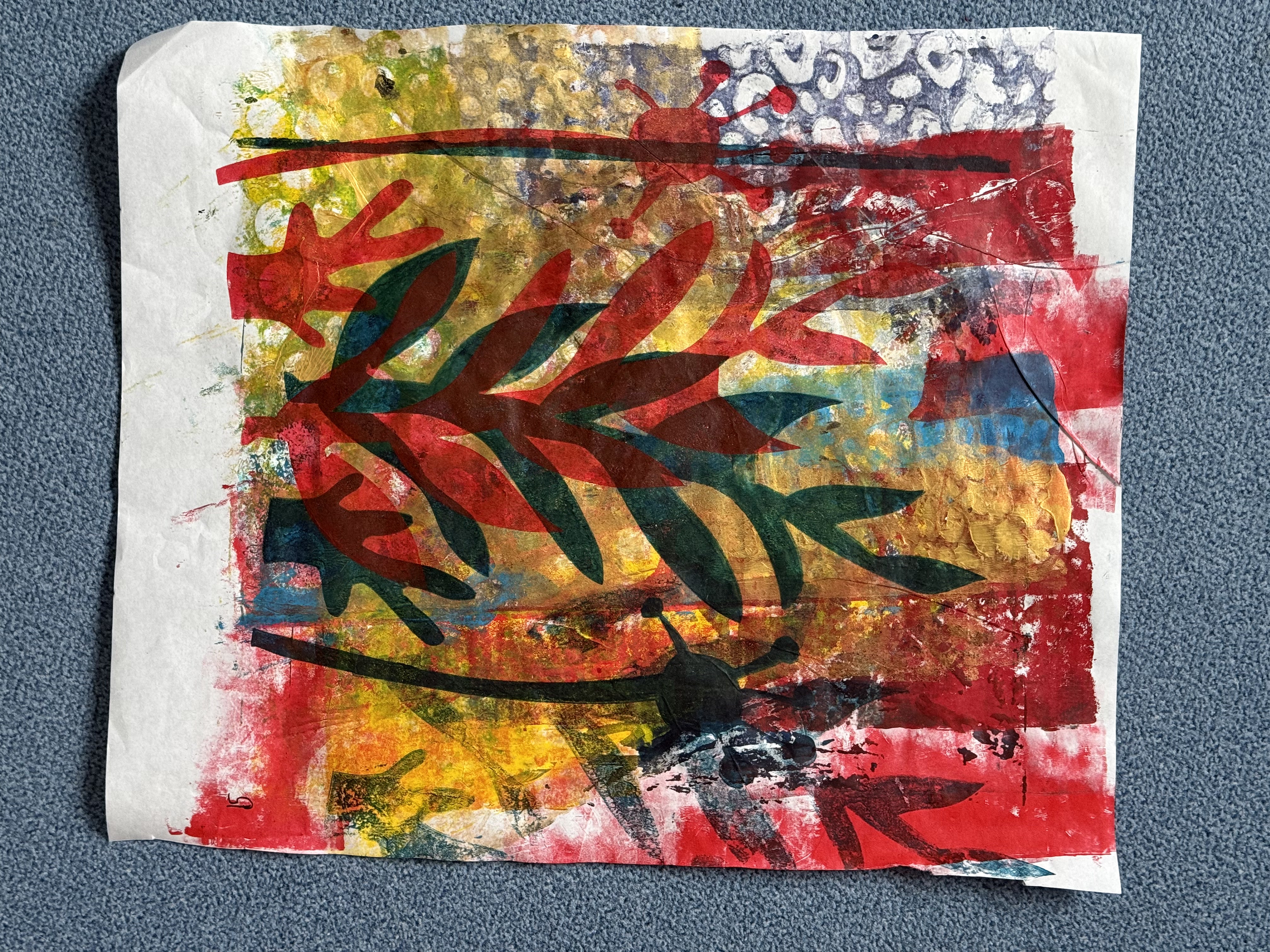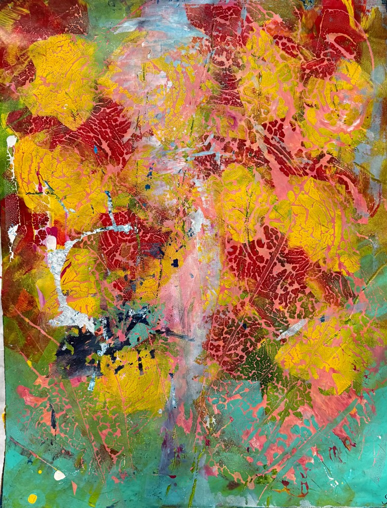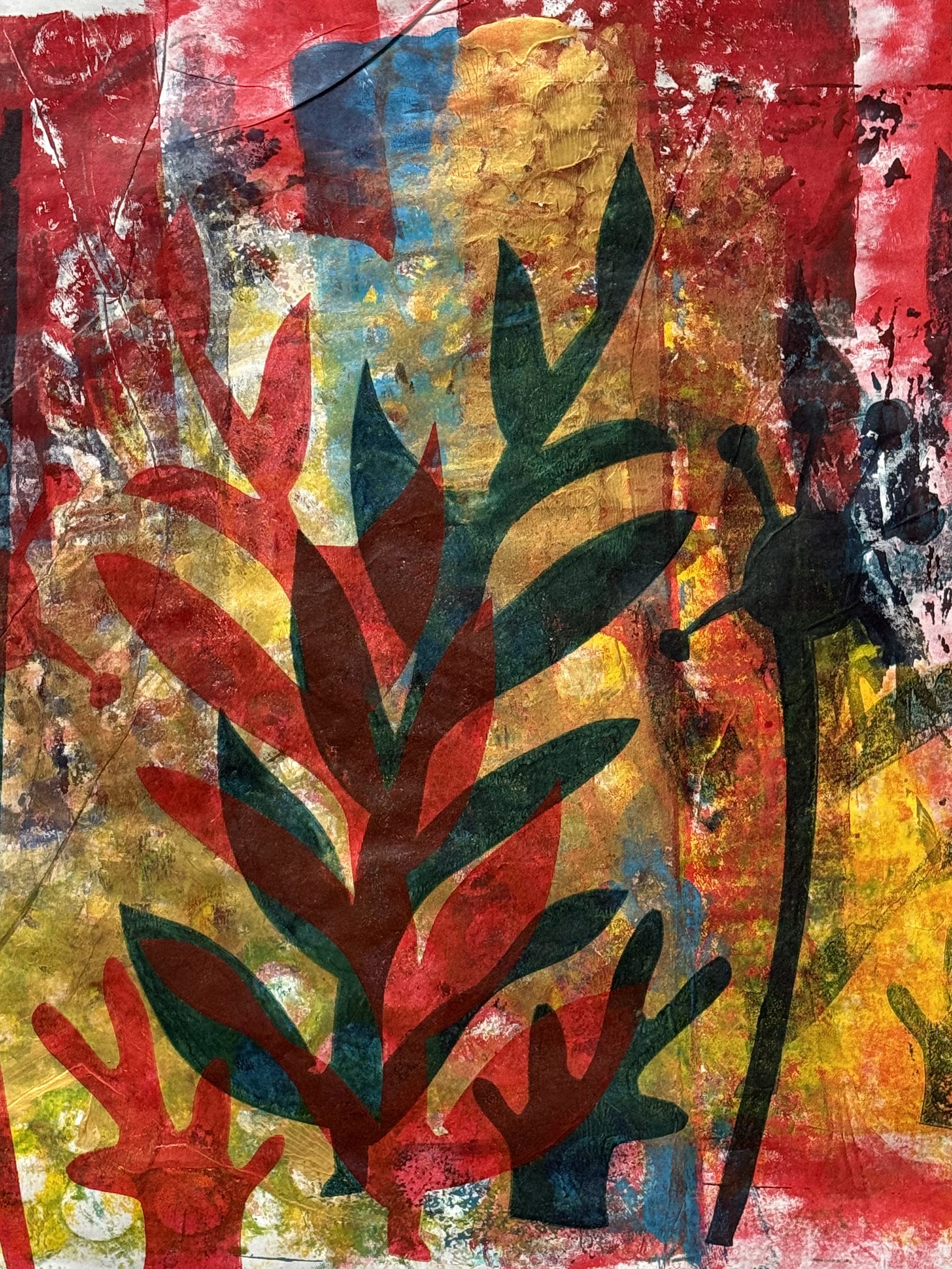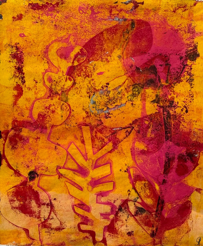 Beim letzten Druck habe ich in der ersten Farbschicht mit Acryl-Tinten gearbeitet. Die sind von der Gelli-Plate abgeperlt, das hat diesen Carquelé-Effekt bewirkt.