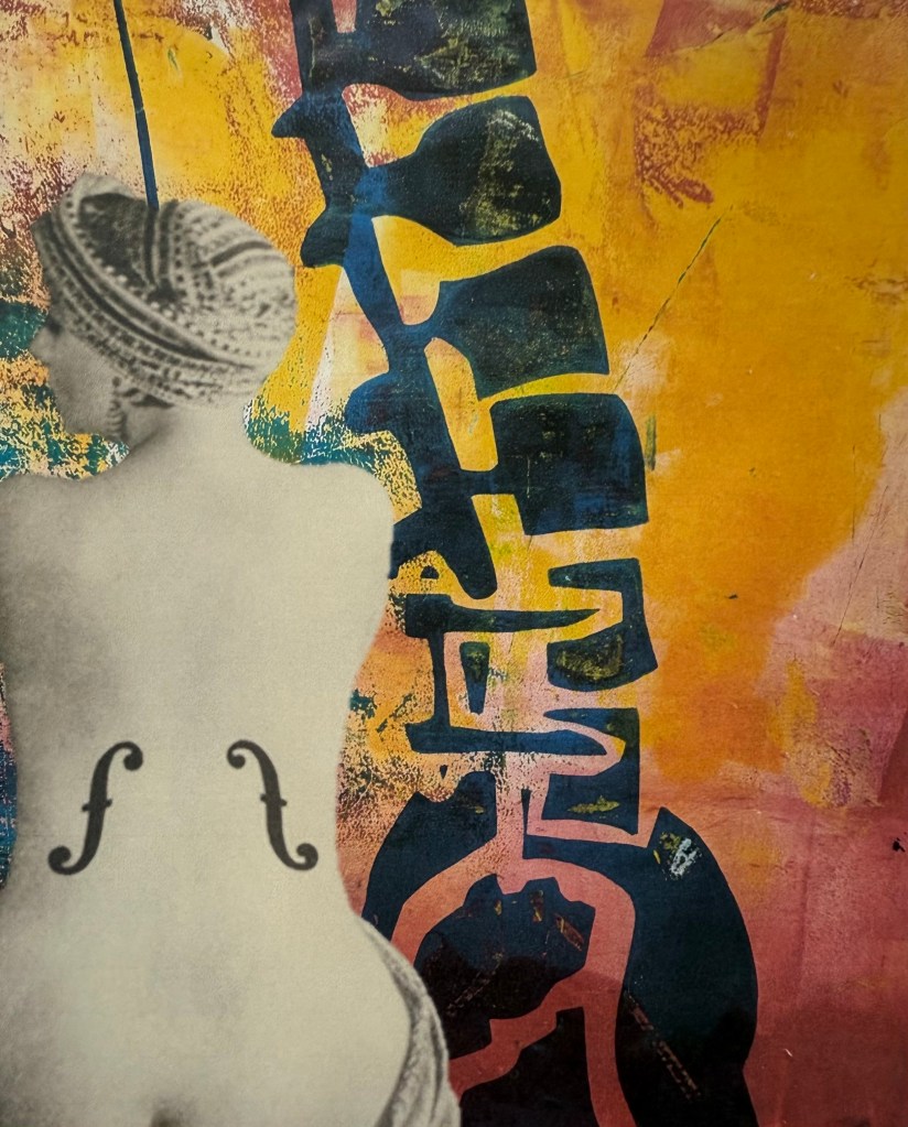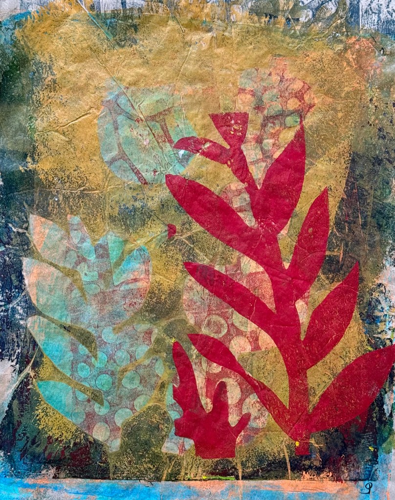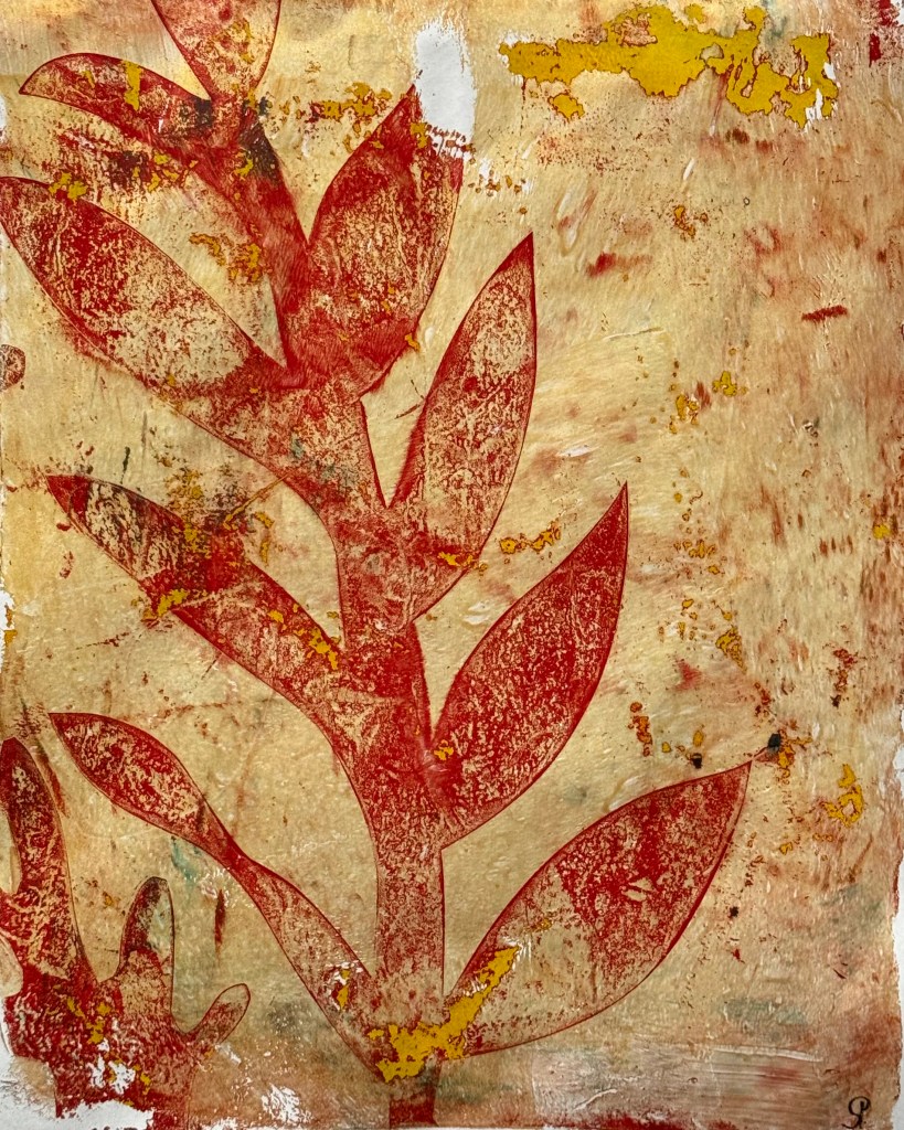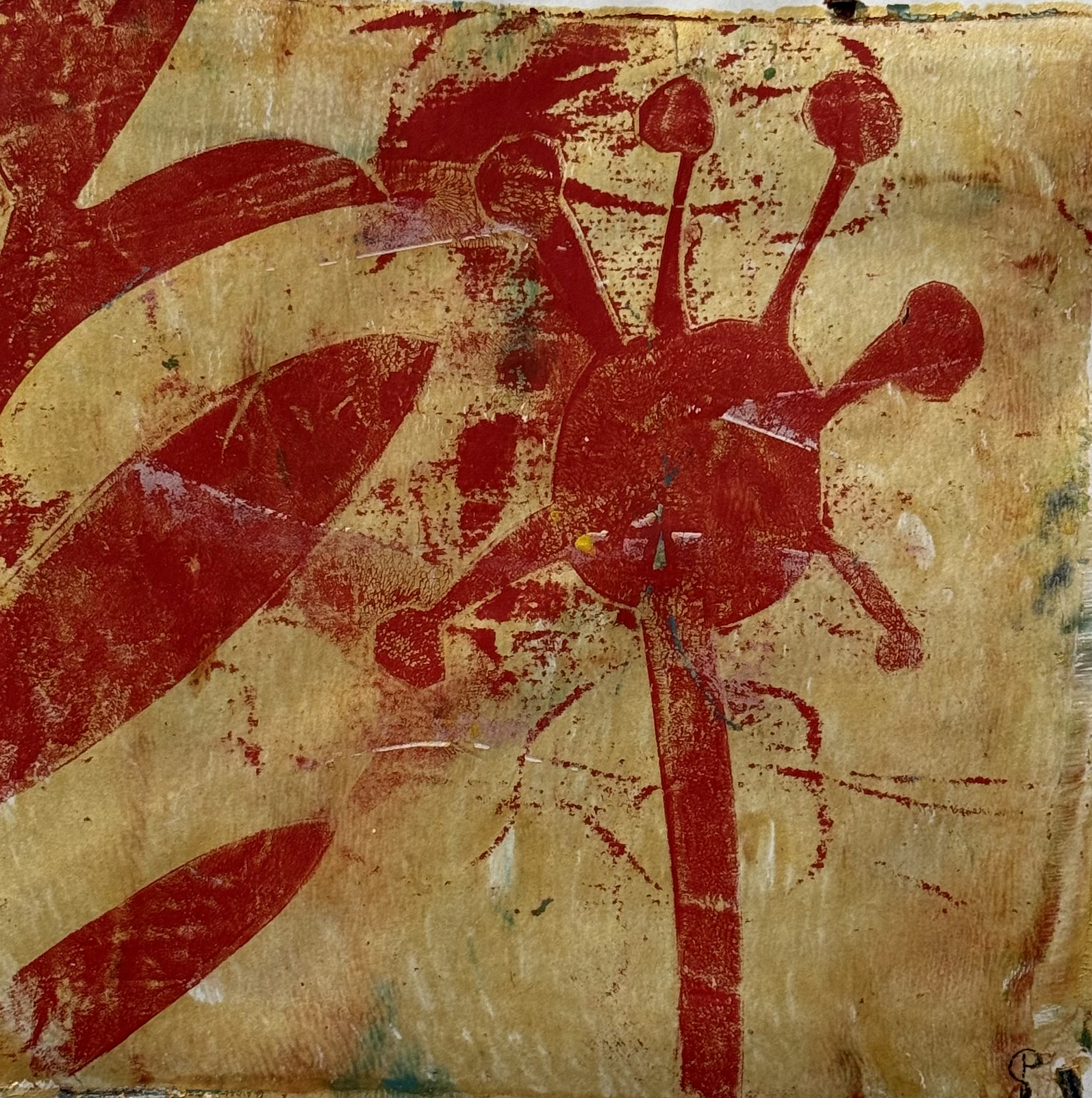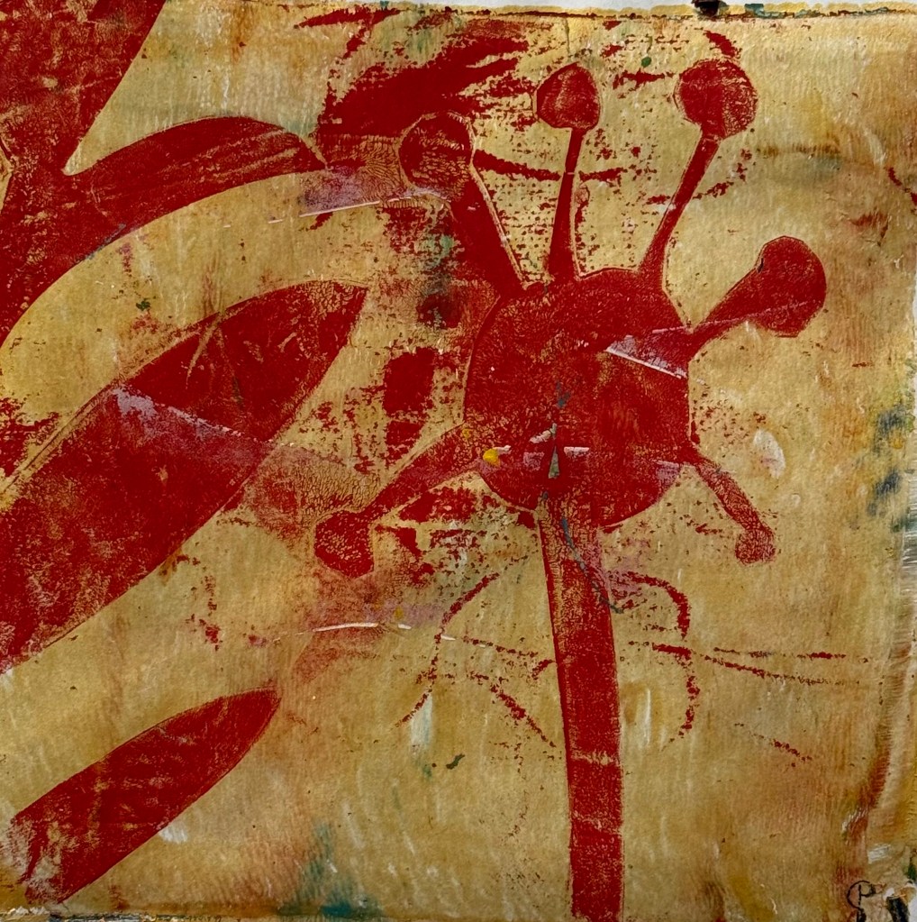 Beim letzten Druck habe ich in der ersten Farbschicht mit Acryl-Tinten gearbeitet. Die sind von der Gelli-Plate abgeperlt, das hat diesen Carquelé-Effekt bewirkt.