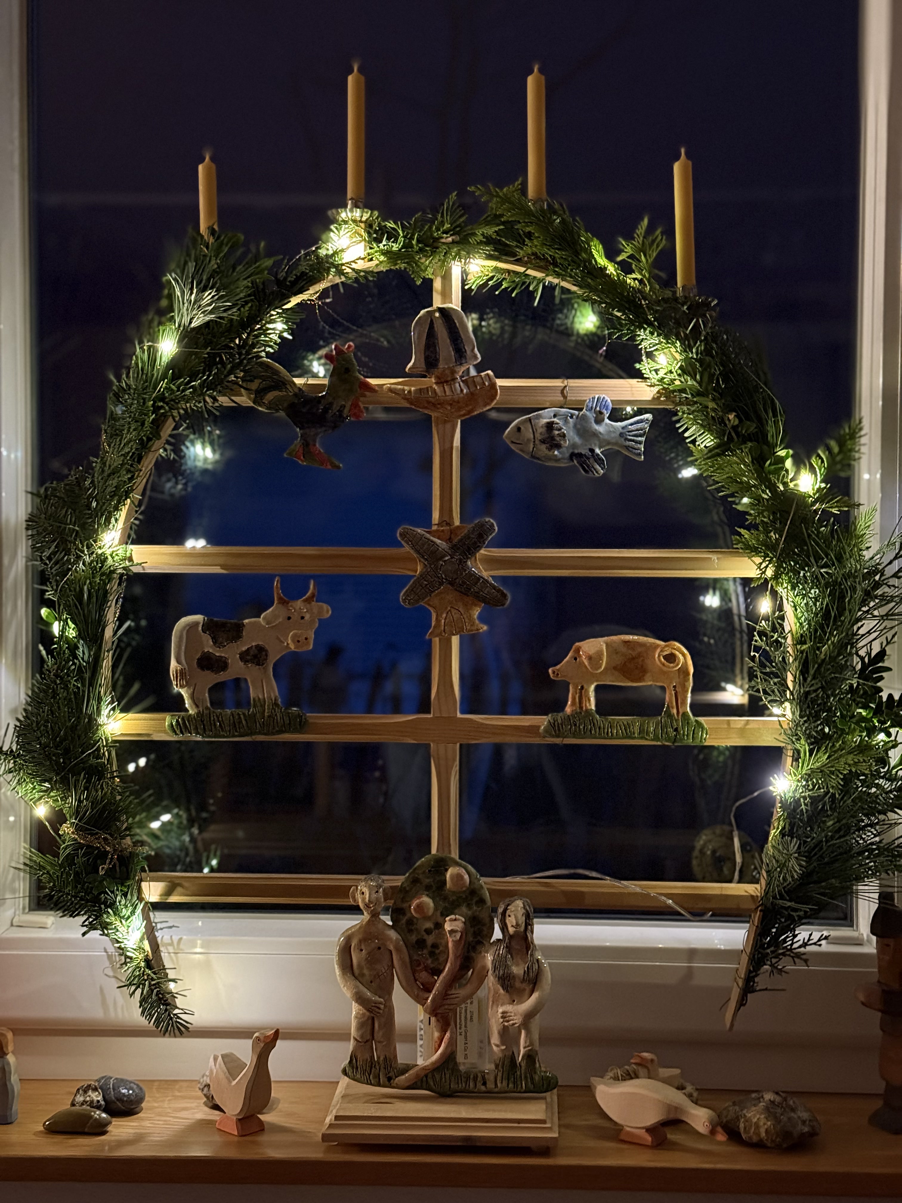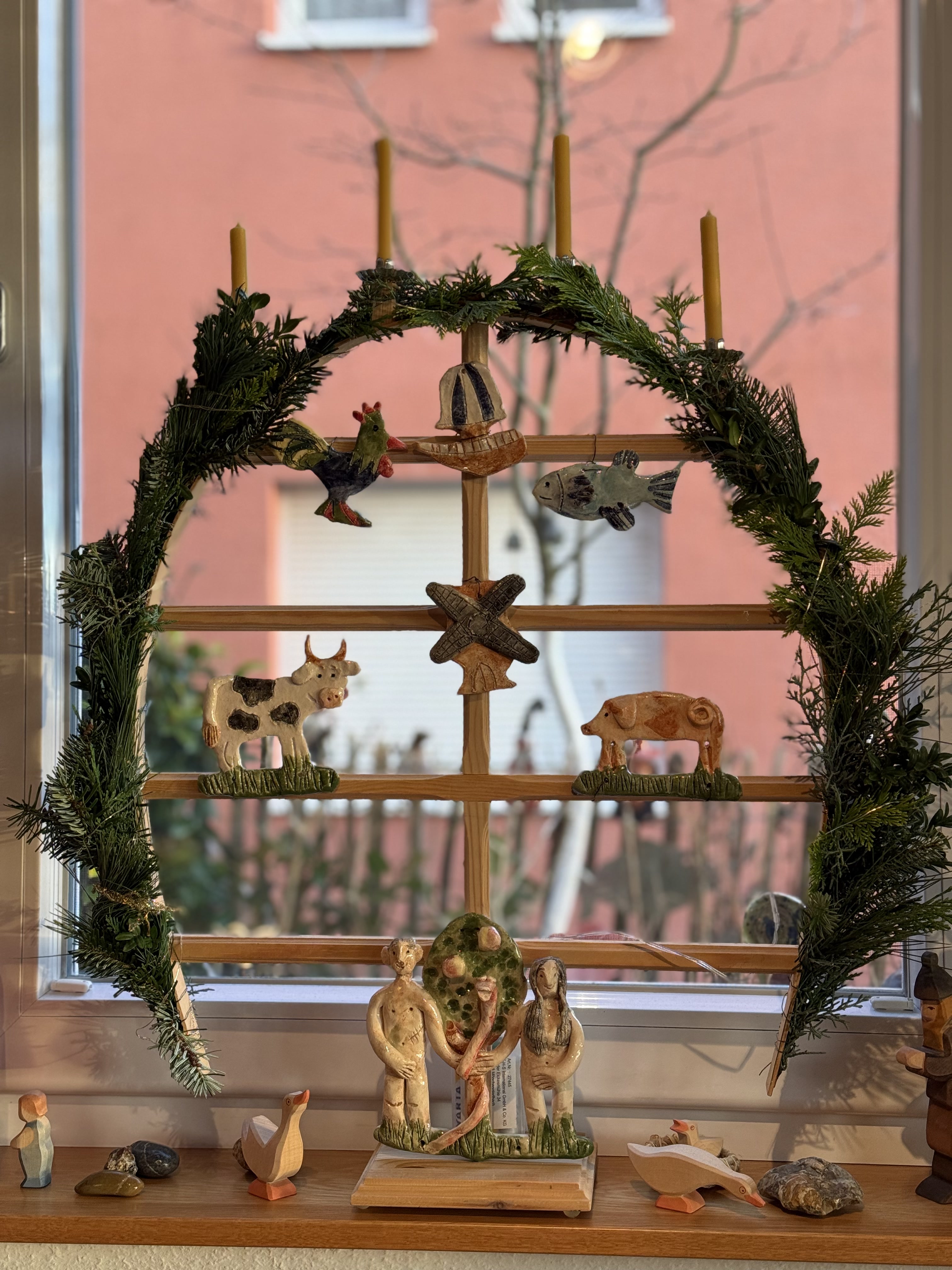 Vorsichtshalber, und weil ich noch „Tannengrün“ vom Adventsgesteck übrig hatte, habe ich den nordfriesischen Baum hergerichtet und bin also bereit: