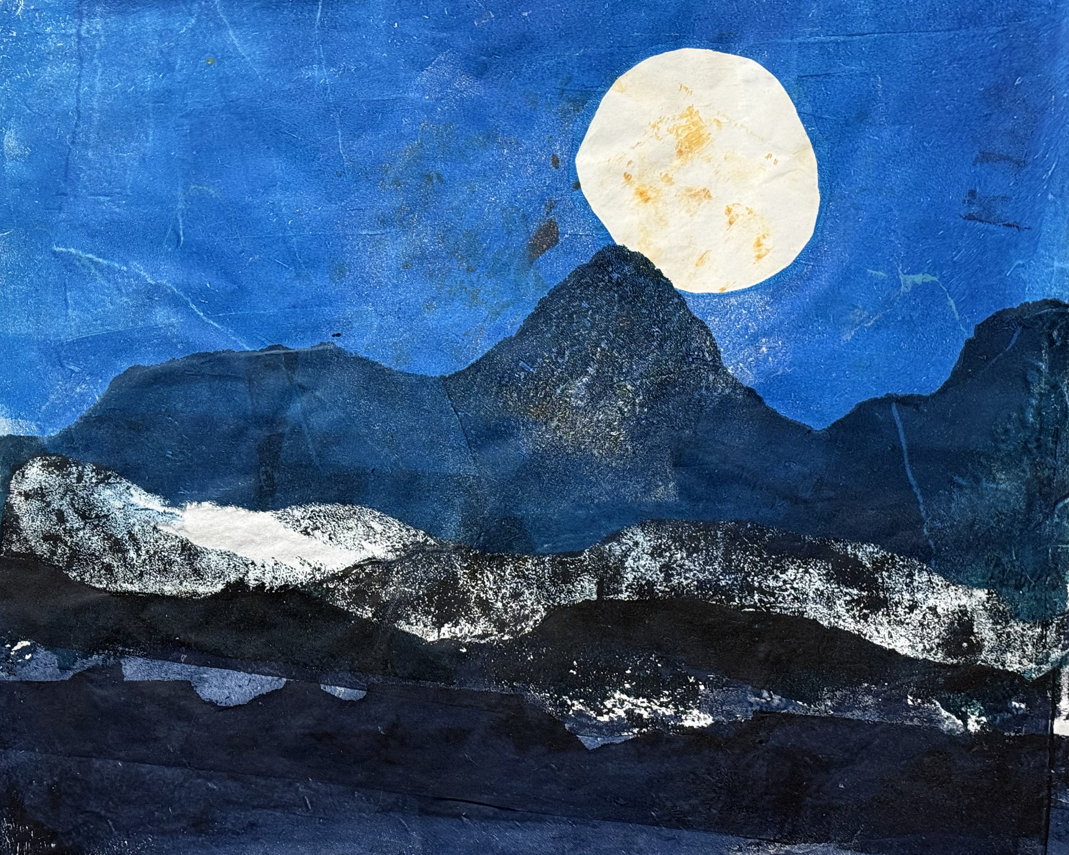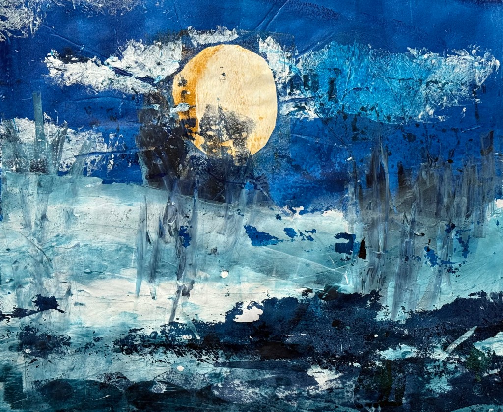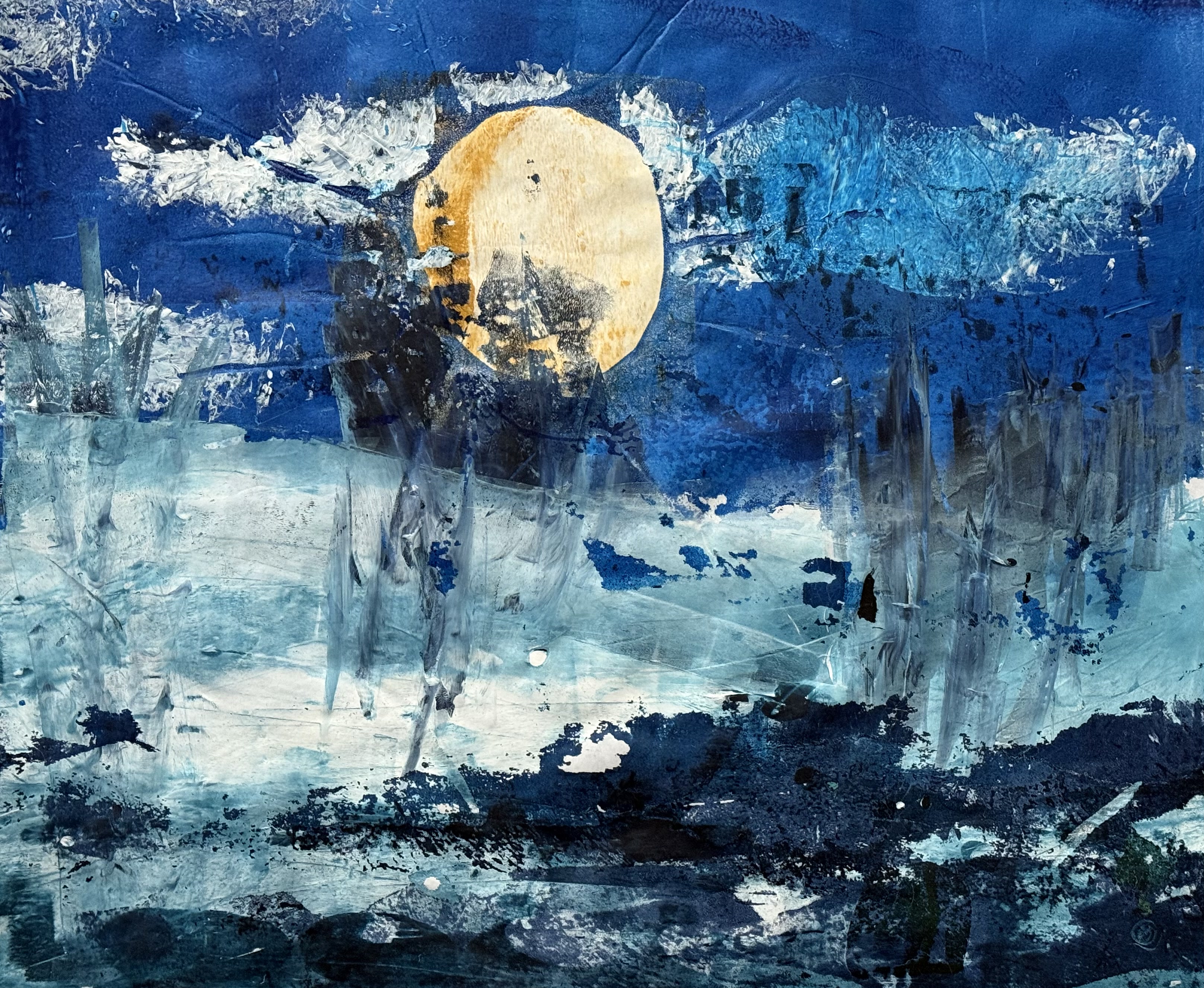 Der erste Vollmond im Jahr heißt Wolfsmond. Die hungrigen Wölfe kamen aus den Wäldern an die Dörfer und Siedlungen heran und heulten den Vollmond an. Keine Wölfe aber Gelliprints mit Kälte, Schnee und Vollmond sind zwischen den Jahren entstanden: