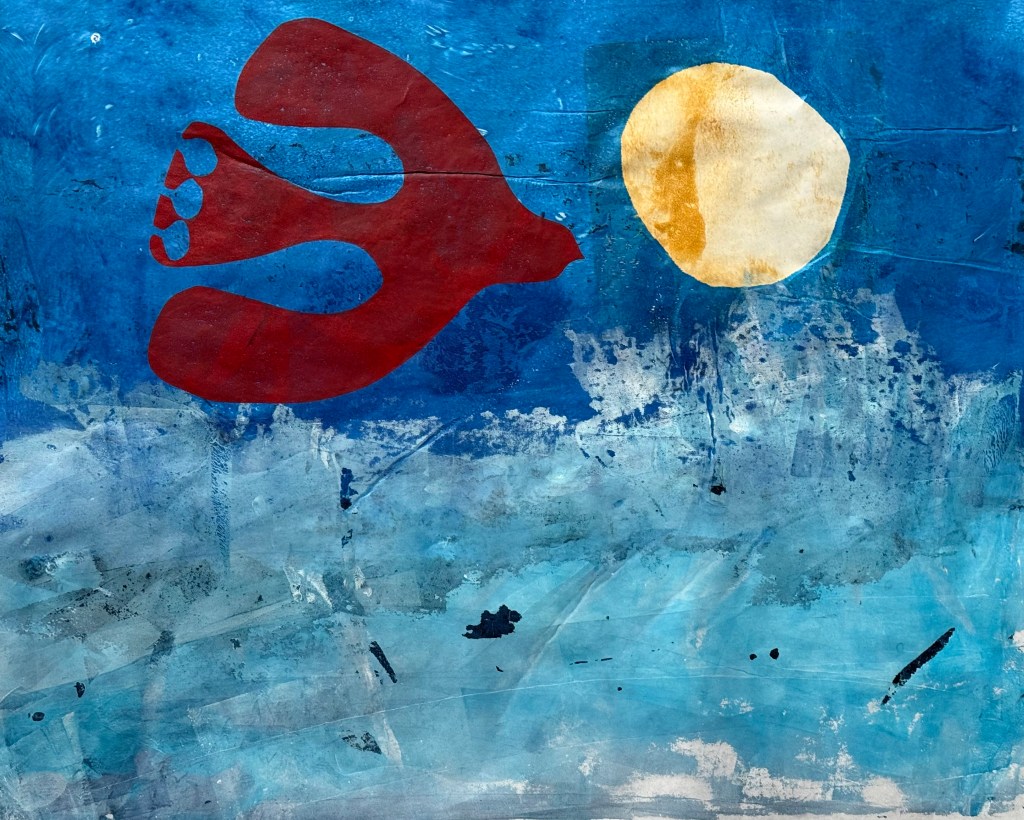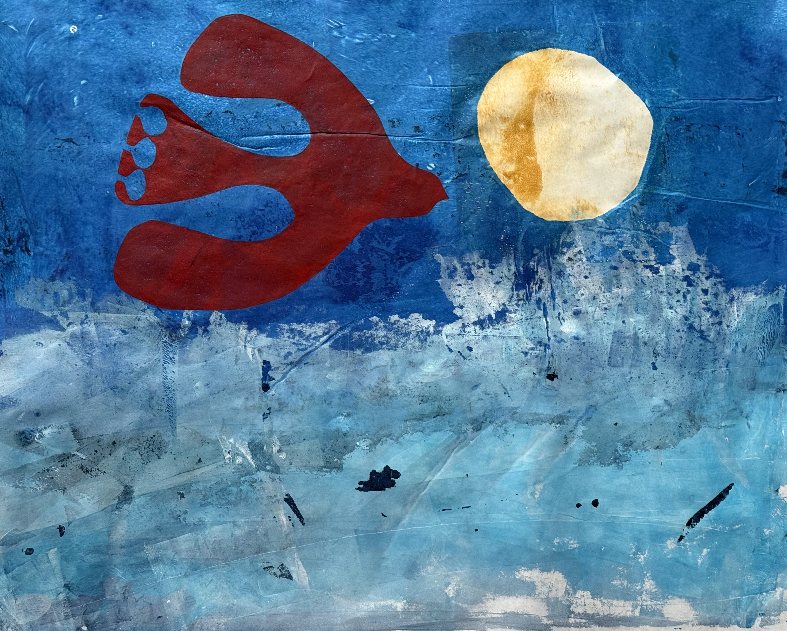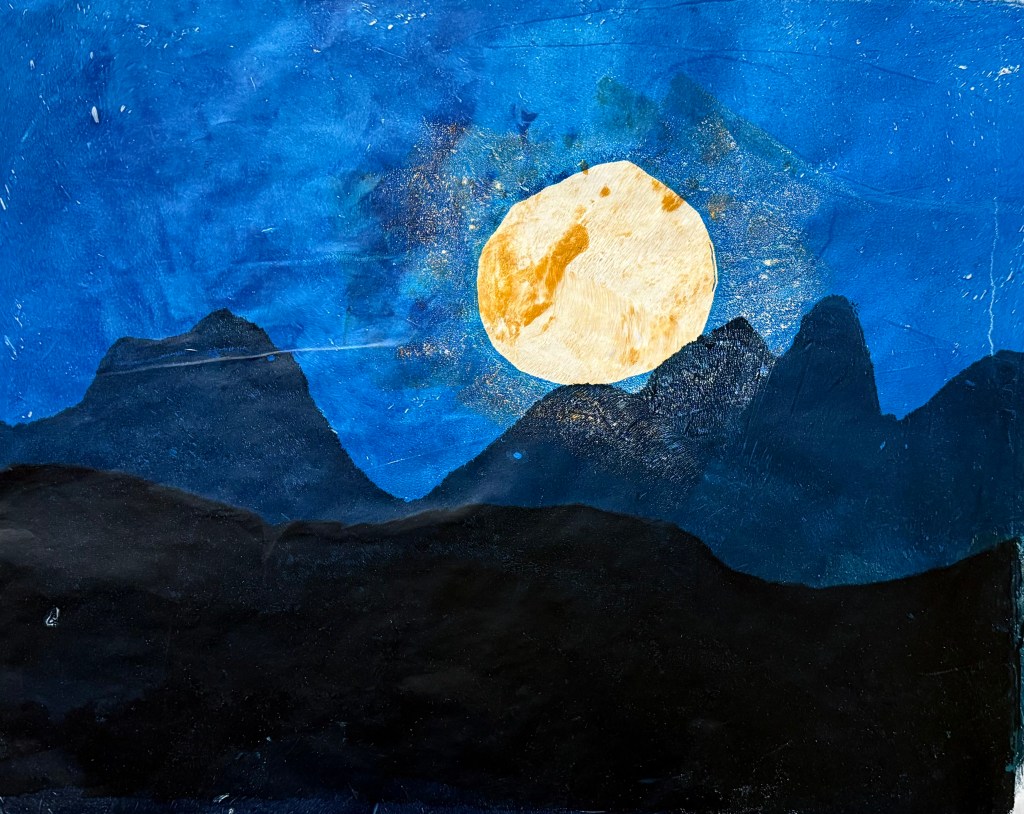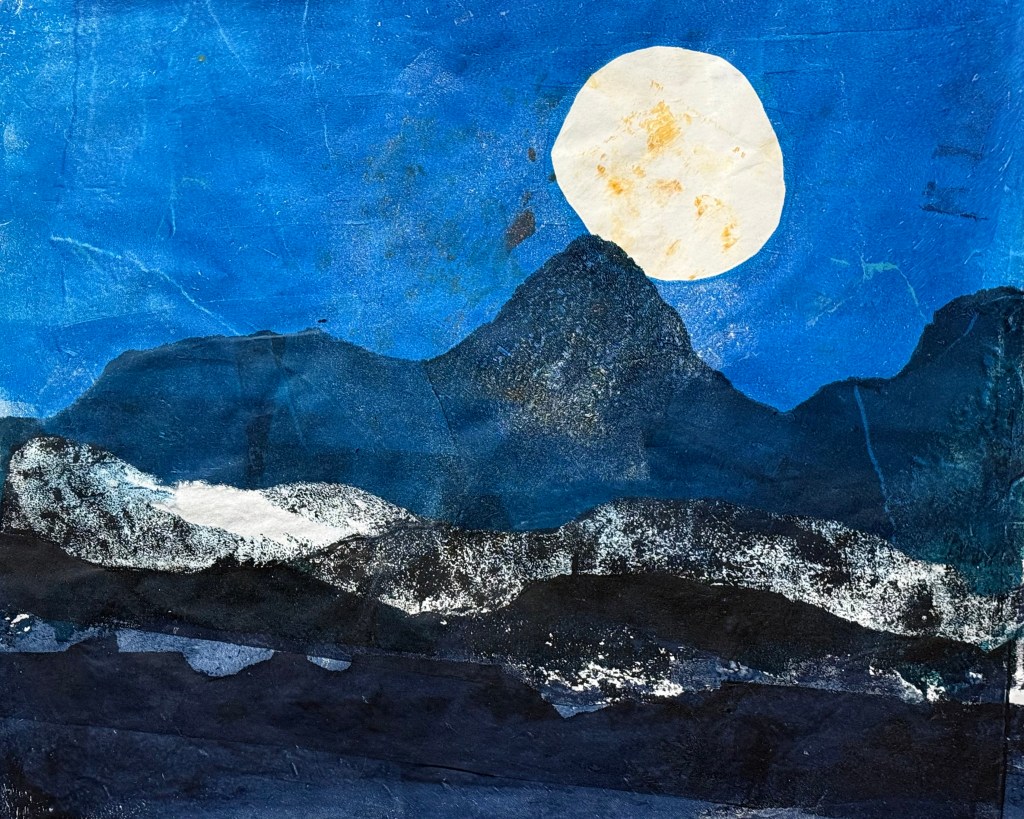 Der erste Vollmond im Jahr heißt Wolfsmond. Die hungrigen Wölfe kamen aus den Wäldern an die Dörfer und Siedlungen heran und heulten den Vollmond an. Keine Wölfe aber Gelliprints mit Kälte, Schnee und Vollmond sind zwischen den Jahren entstanden: