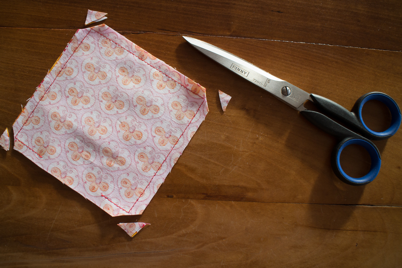 Meine sind 10x 10 cm groß, kleiner ist schöner, wird aber ziemlich knifflig zu nähen. Die Quadrate rechts auf rechts zusammen nähen, eine Wendeöffnung lassen: