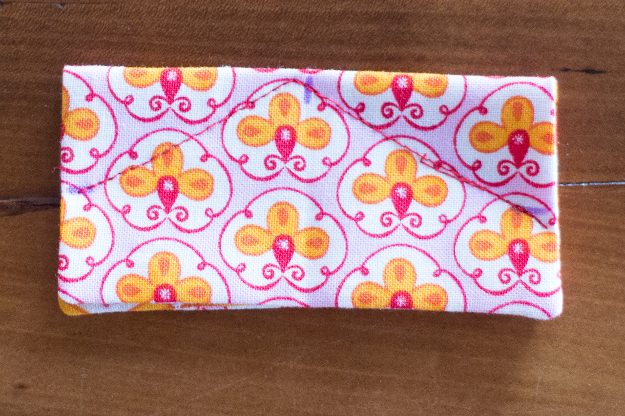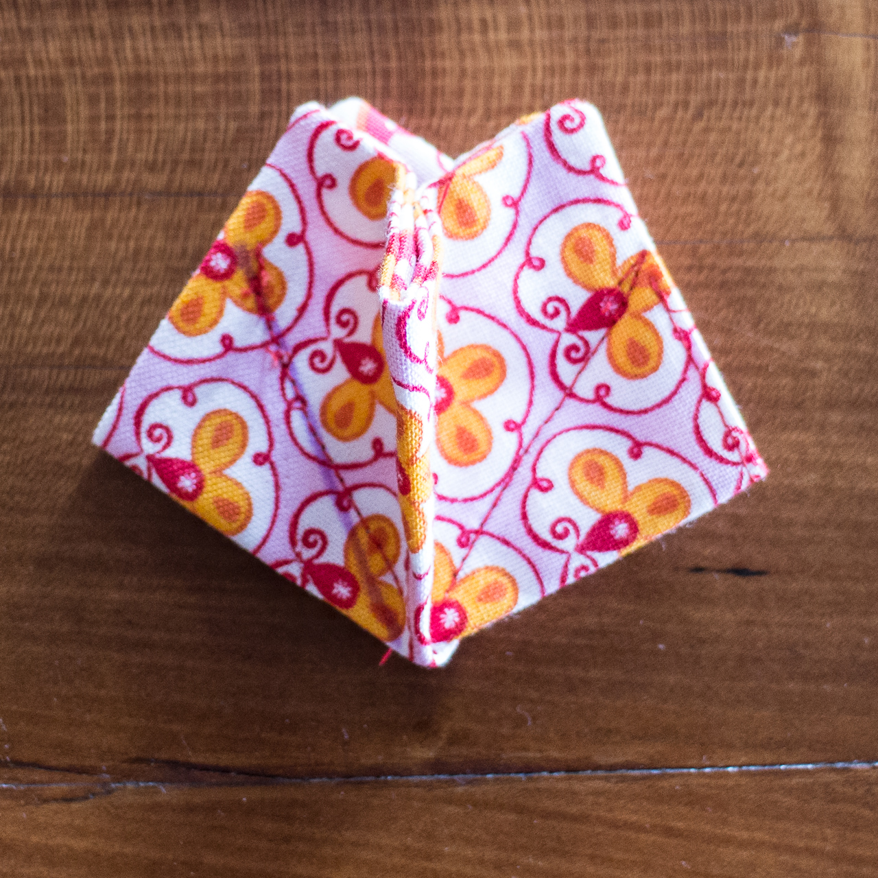 Den Stoff öffnen, Naht auf Naht legen, und mit den beiden übrigen Seiten ebenso verfahren.