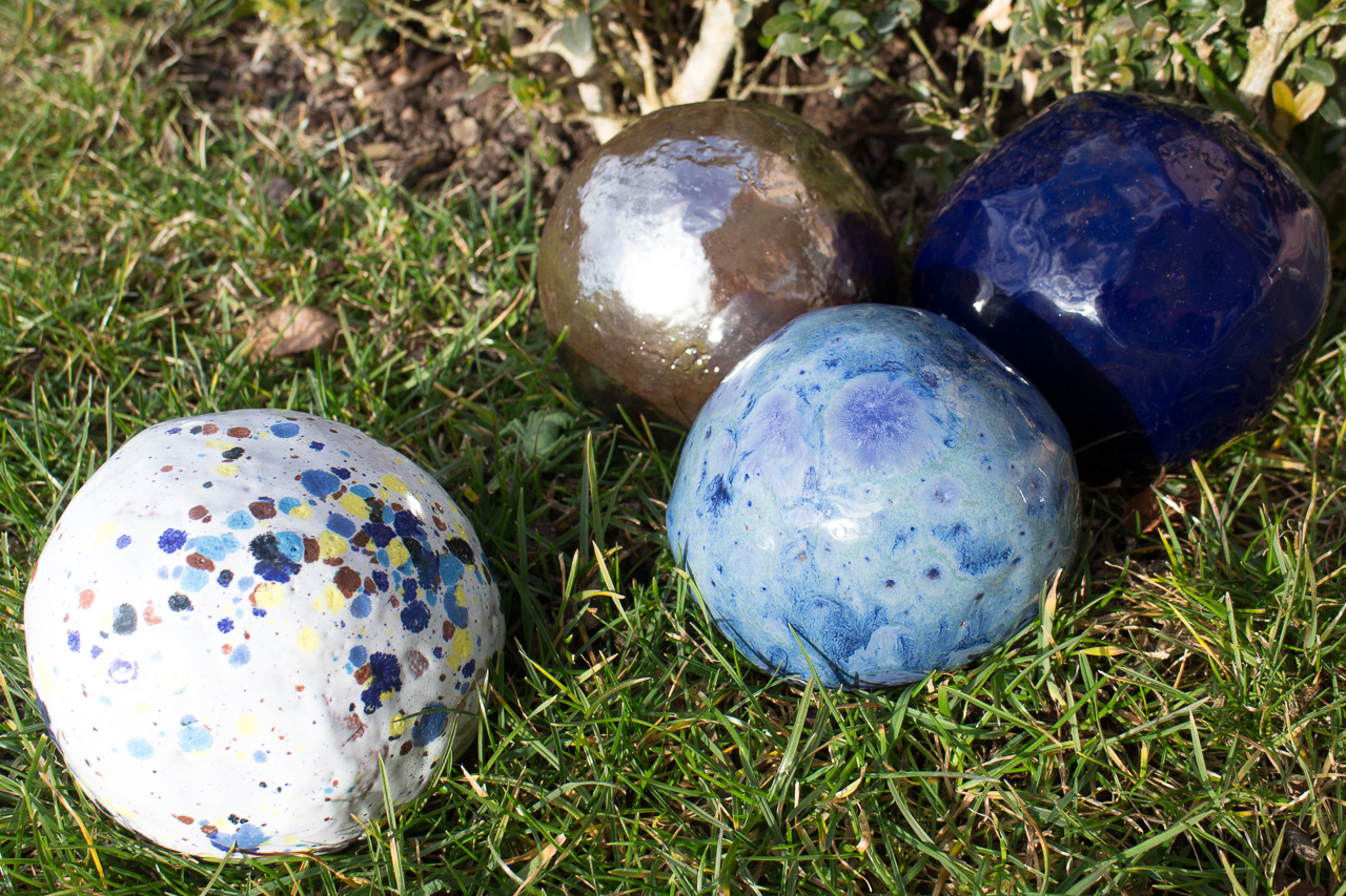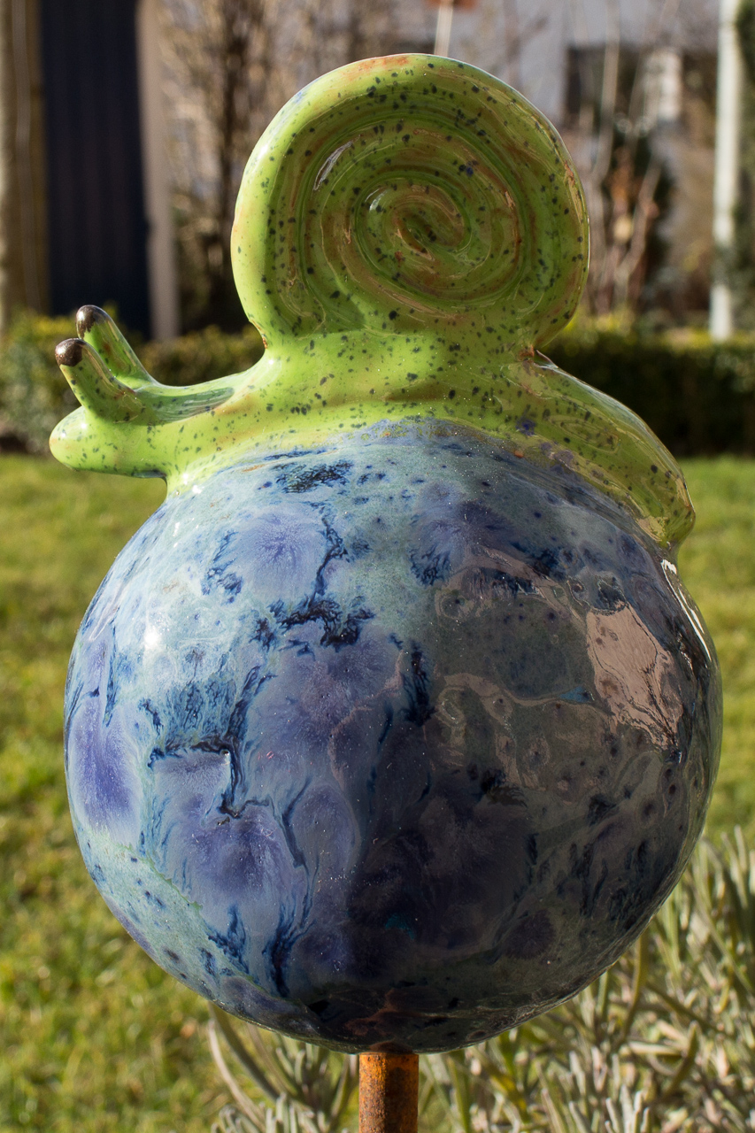 Die meisten Glasuren auf diesen Bildern sind Fertigglasuren der Firma Botz (alle Blautöne, weiß und rot). Sie sind gut zu verarbeiten, man muss sie allerdings zwei- bis dreimal auftragen, das dauert, weil sie ja zwischendrin immer wieder trocknen sollen. Obwohl ich die Ränder der Dosen immer gut reinige vor dem Zuschrauben, trocknen mir manchen Farben ein. Aber bisher habe ich sie mit Wasser immer wieder gut aufrühren können.