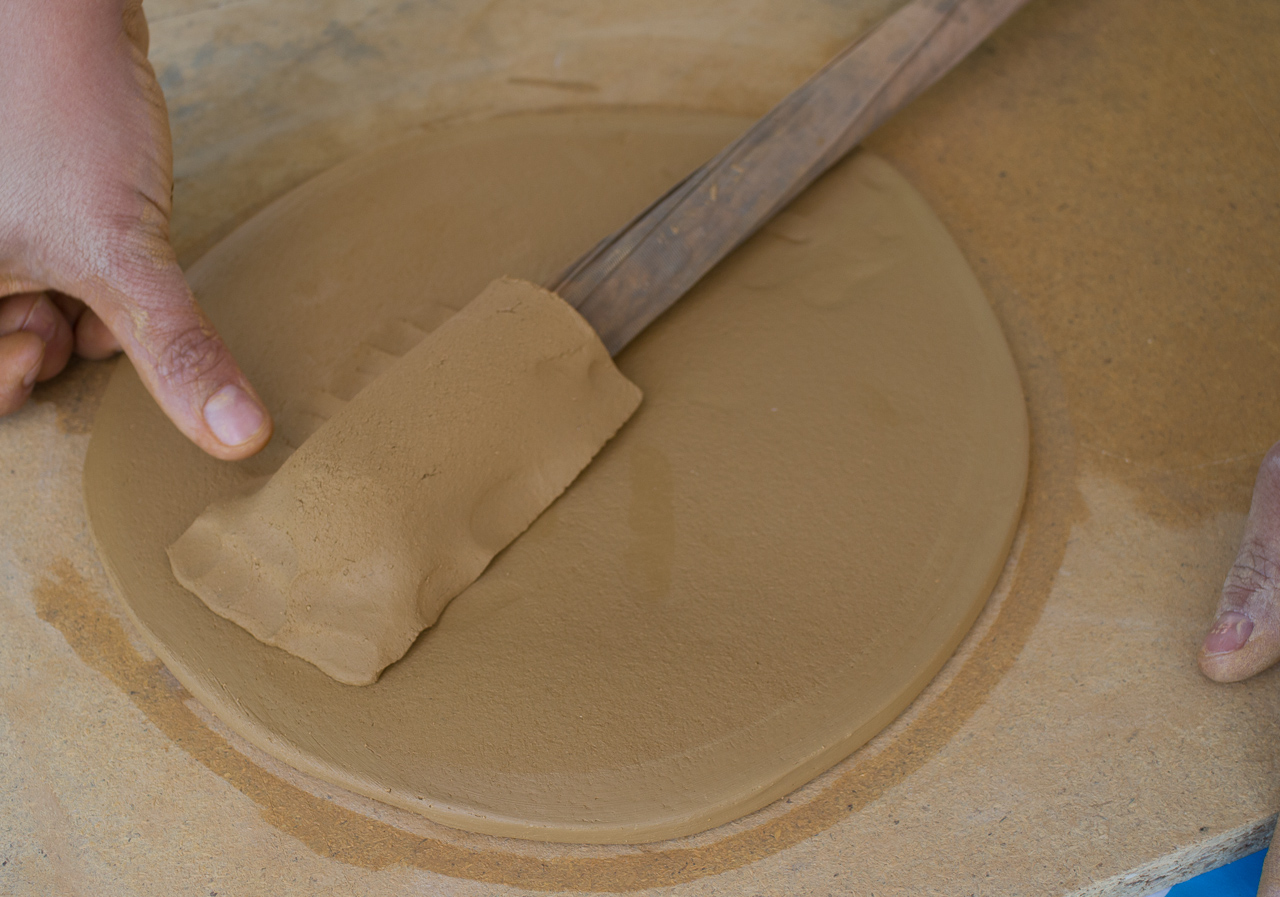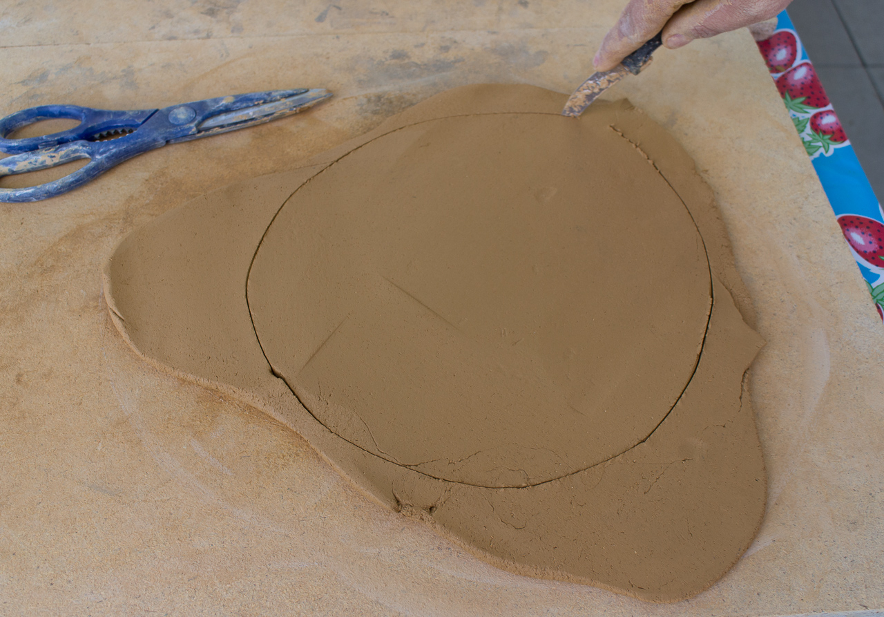 Für meine Tonblumen habe ich den Ton etwa 1 cm dick ausgerollt und einen nicht exakten Kreis ausgeschnitten.