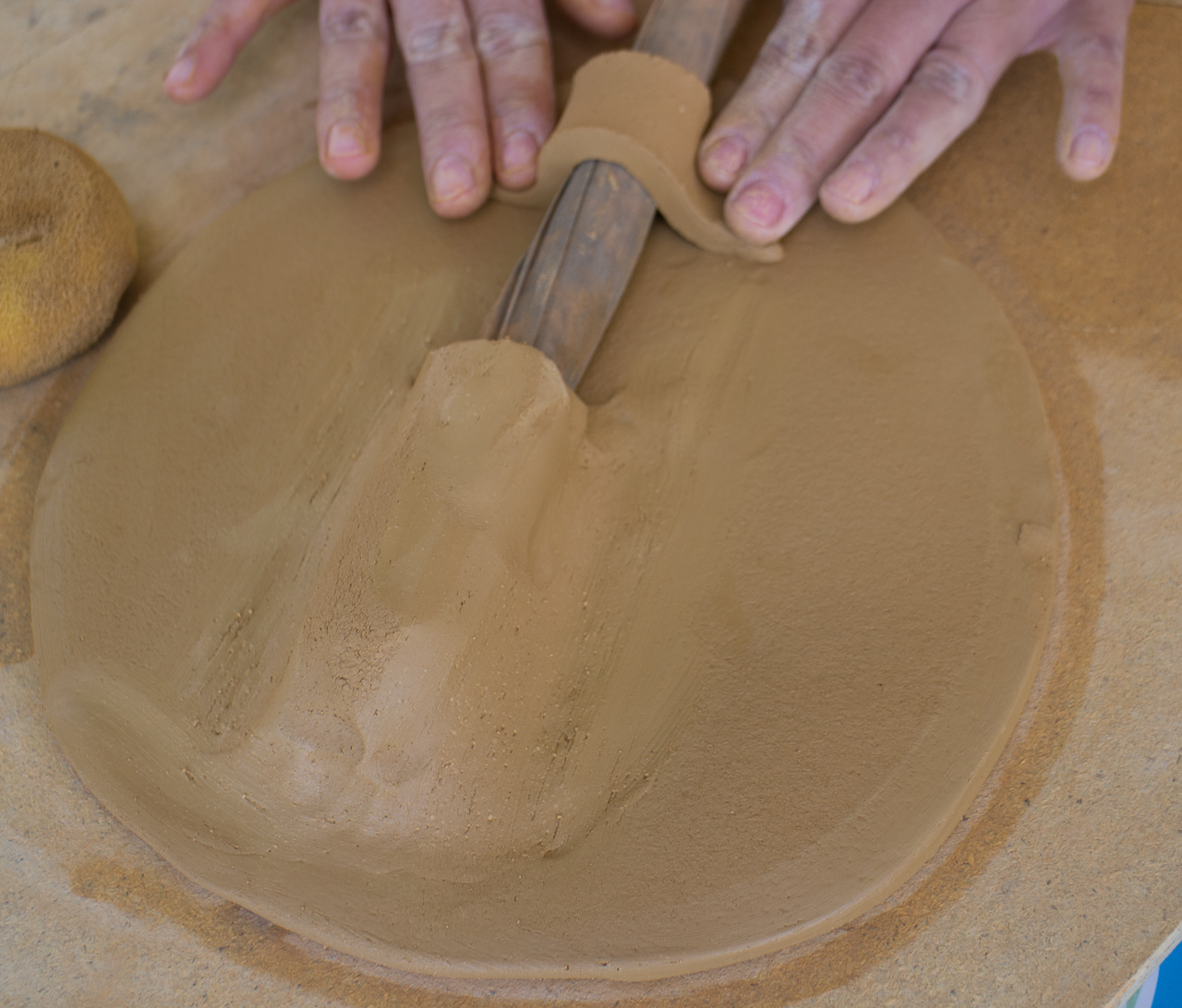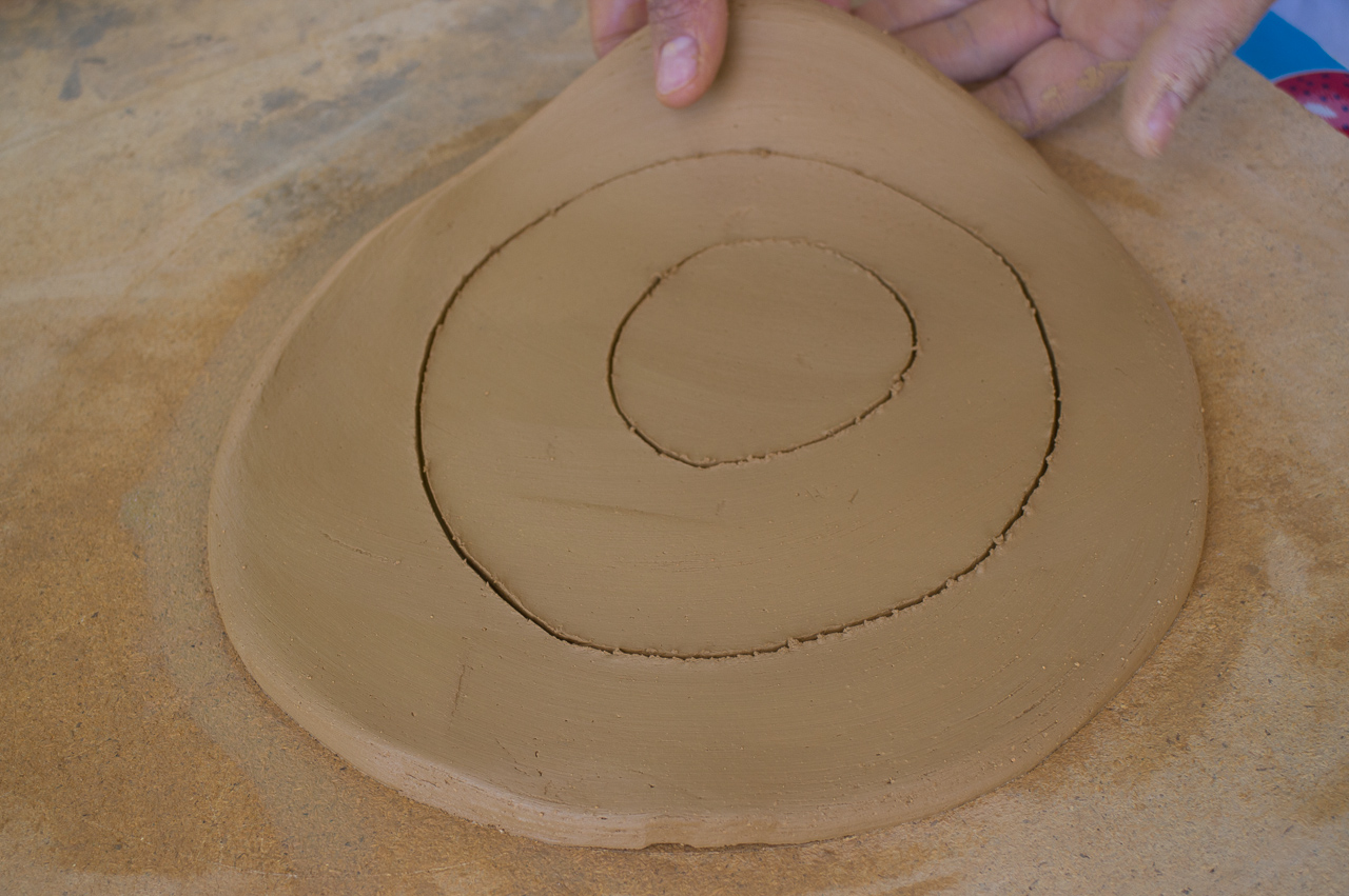 Mit einer alten Stricknadel habe ich „schiefe, konzentrische“ Kreise eingeritzt. Dann kann ich die Blumen leichter glasieren.