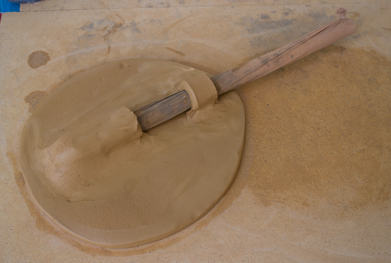 Damit das Rundholz, das ich als „Platzhalter“ verwendet habe, nicht am Ton festklebt, habe ich es in alte Nylonstrümpfe gepackt.