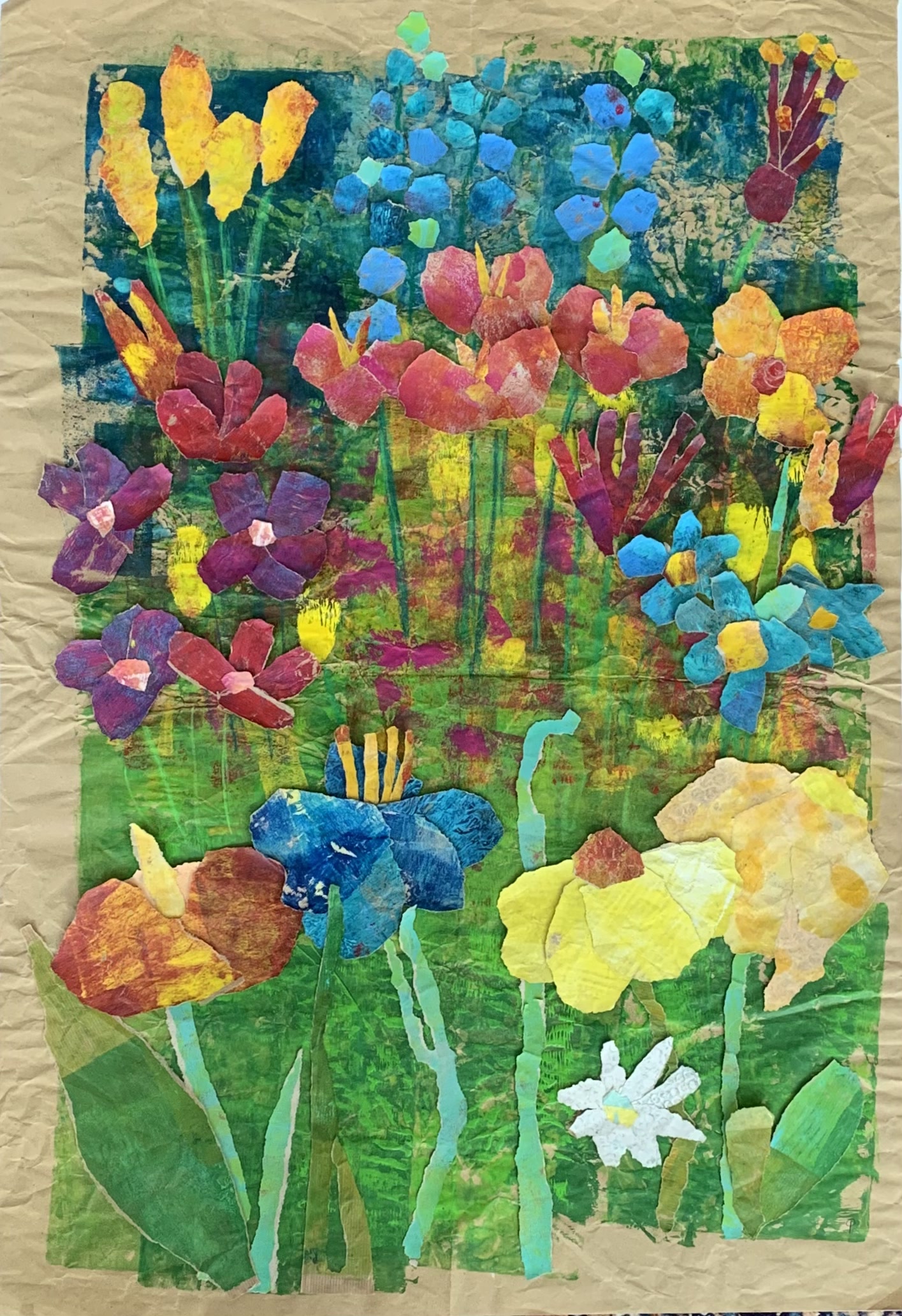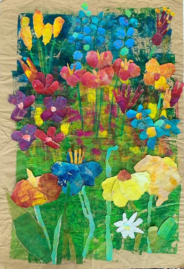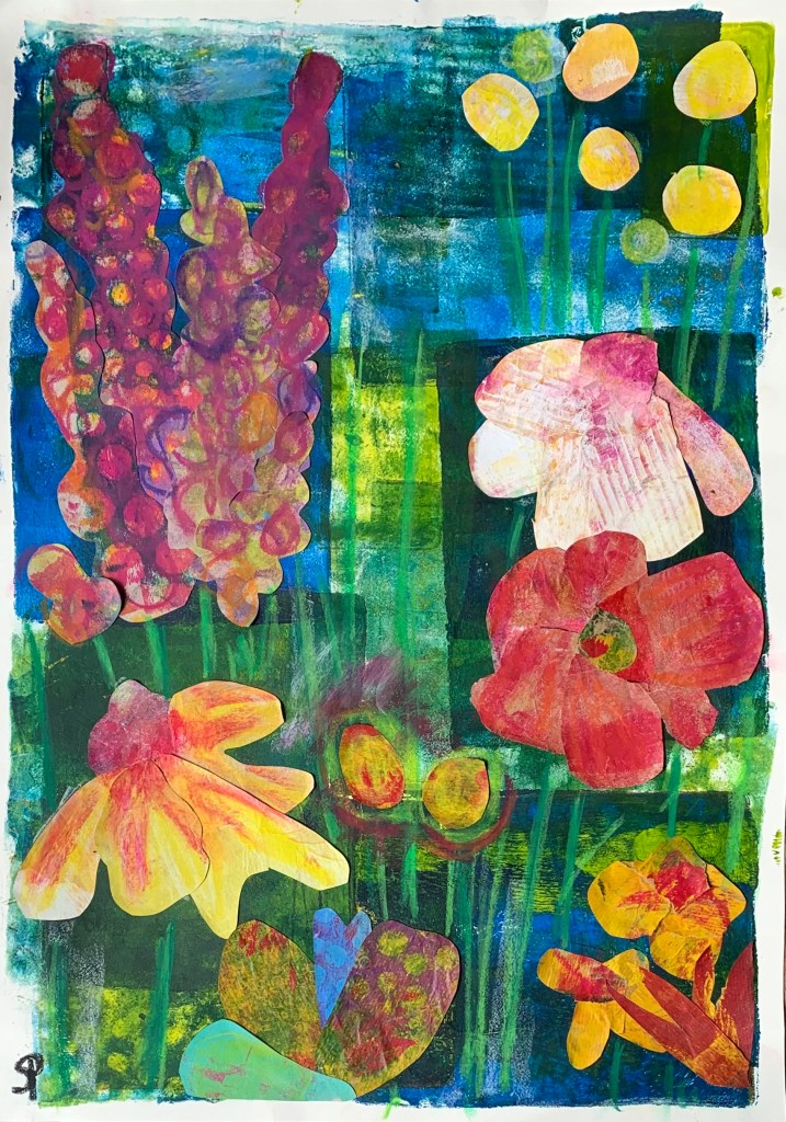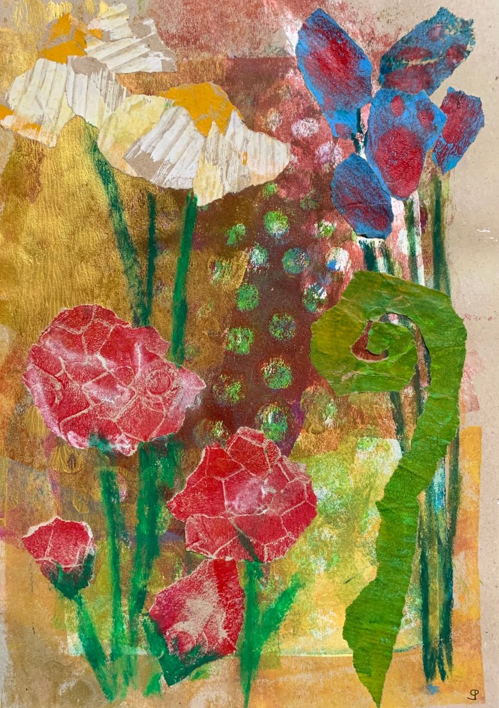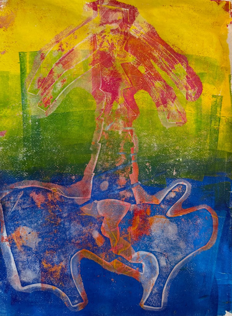 Meine Wirbelsäule beschäftigt mich schon eine ganze Weile, Mitte Mai stand die OP an. Alles ist super gelaufen, trotzdem treibt mich dieses Thema immer noch um. Auf der Basis von Röntgenbildern habe ich Schablonen für Gelli-Prints hergestellt, die ich nun zu einer großen Collage (70×100) verarbeitet habe.