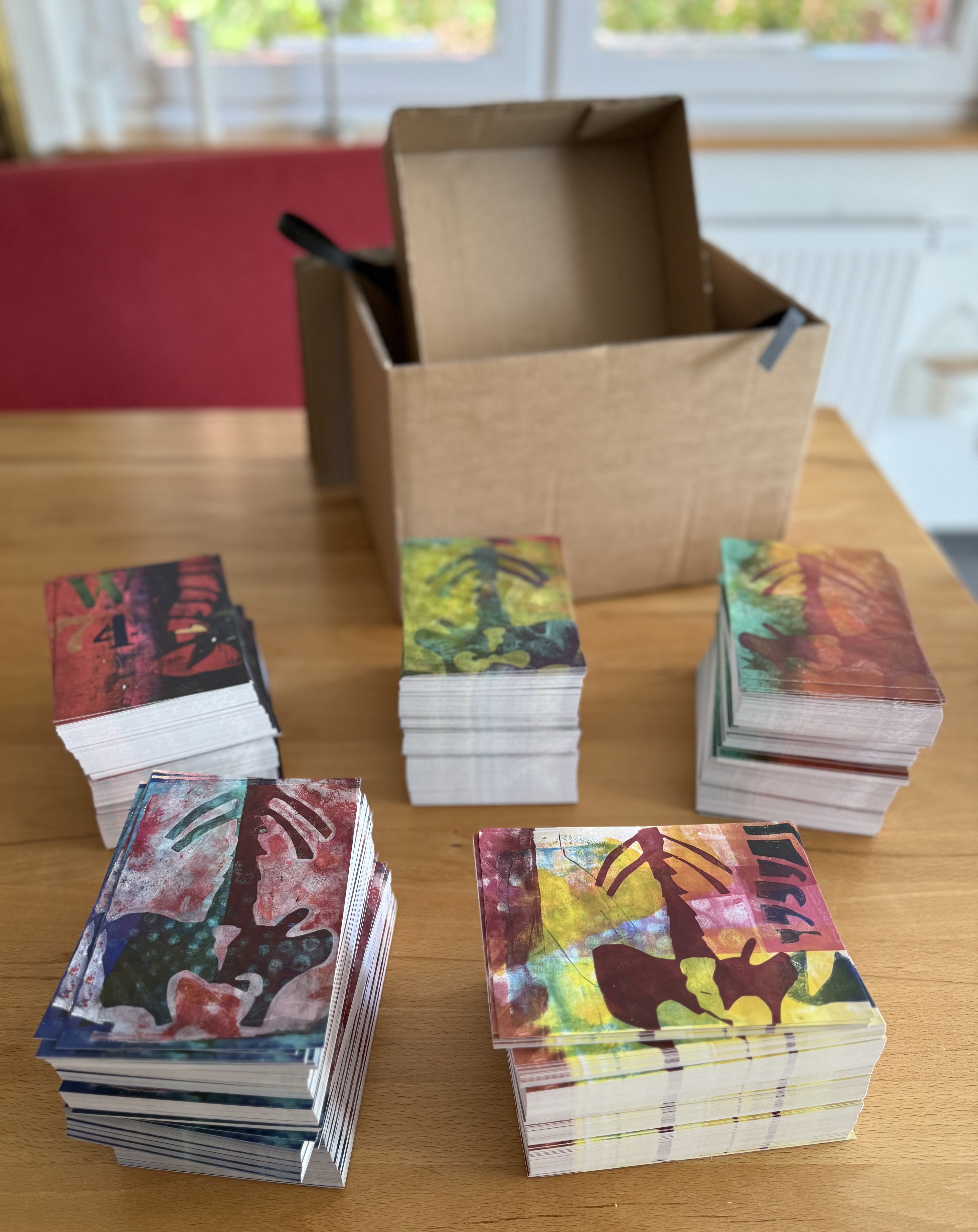 Ich habe Postkartensätze bestellt: die fünf Motive je zehn Mal…. Gestern ist das Paket gekommen, das seltsam schwer war. Jetzt habe ich 1000 Postkarten. 1000 Stück! Und ich darf sie behalten. Natürlich habe ich sofort bei der Druckerei angerufen. „Das passiert schon mal, dass sie die Maschine länger laufen lassen.“ Wie wunderbar! Ich bin total glücklich.