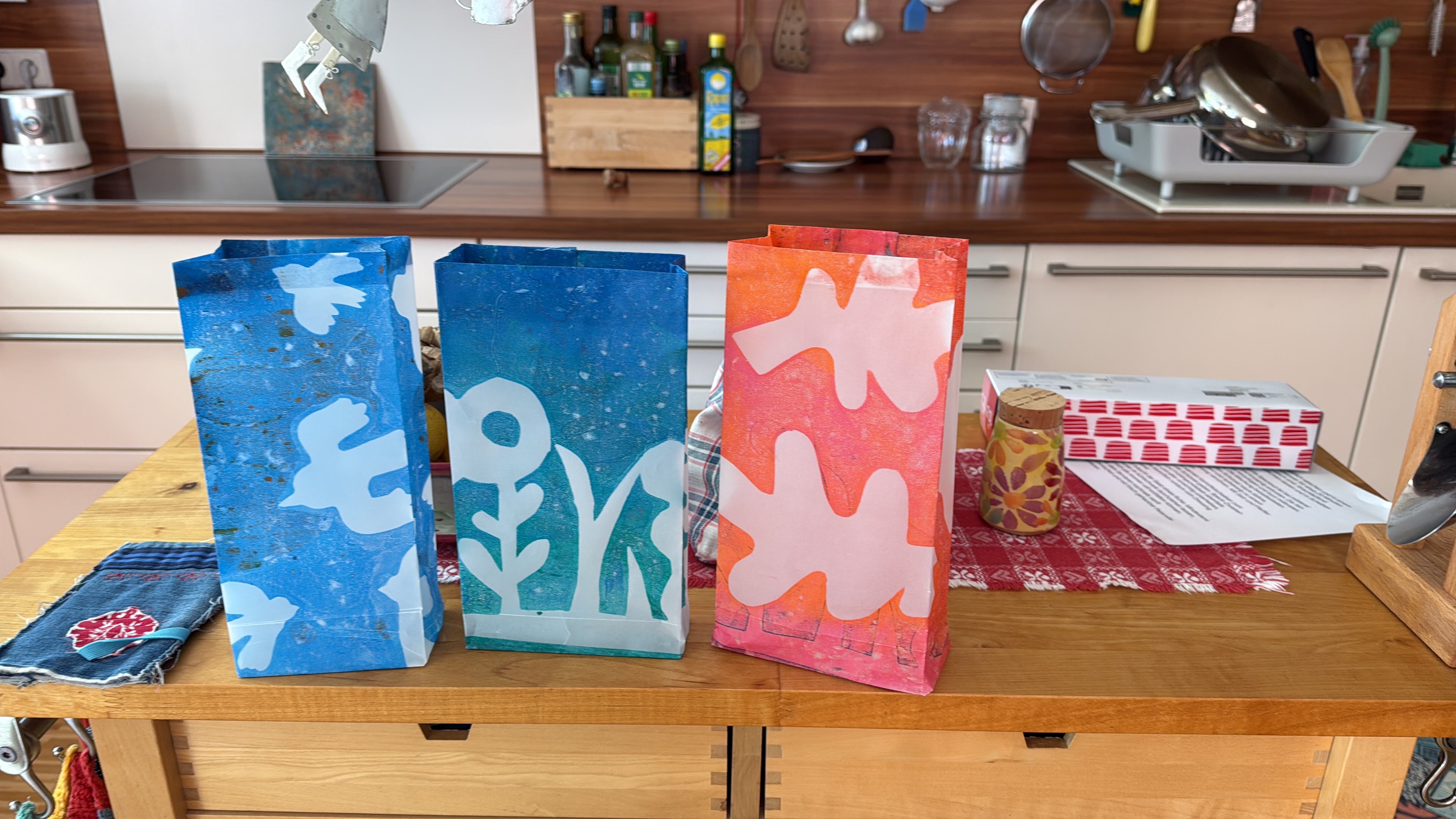 Dazu habe ich verschiedene Motiv-Schablonen ausgeschnitten und Ein-oder Zweischichtdrucke angefertigt. Erstaunlich, wie unterschiedlich die Wirkung ist.