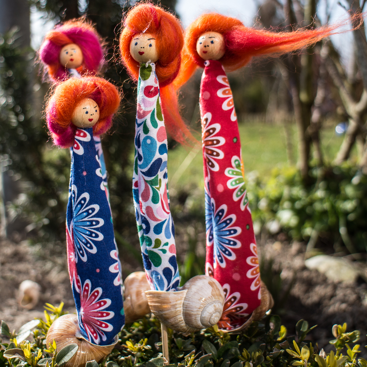 Vielleicht umso mehr ein Grund, aus leeren Schneckenhäuschen, die man im Frühjahr in Hecken und am Feldrand finden kann, ein paar hübsche Schneckenmädchen zu basteln.